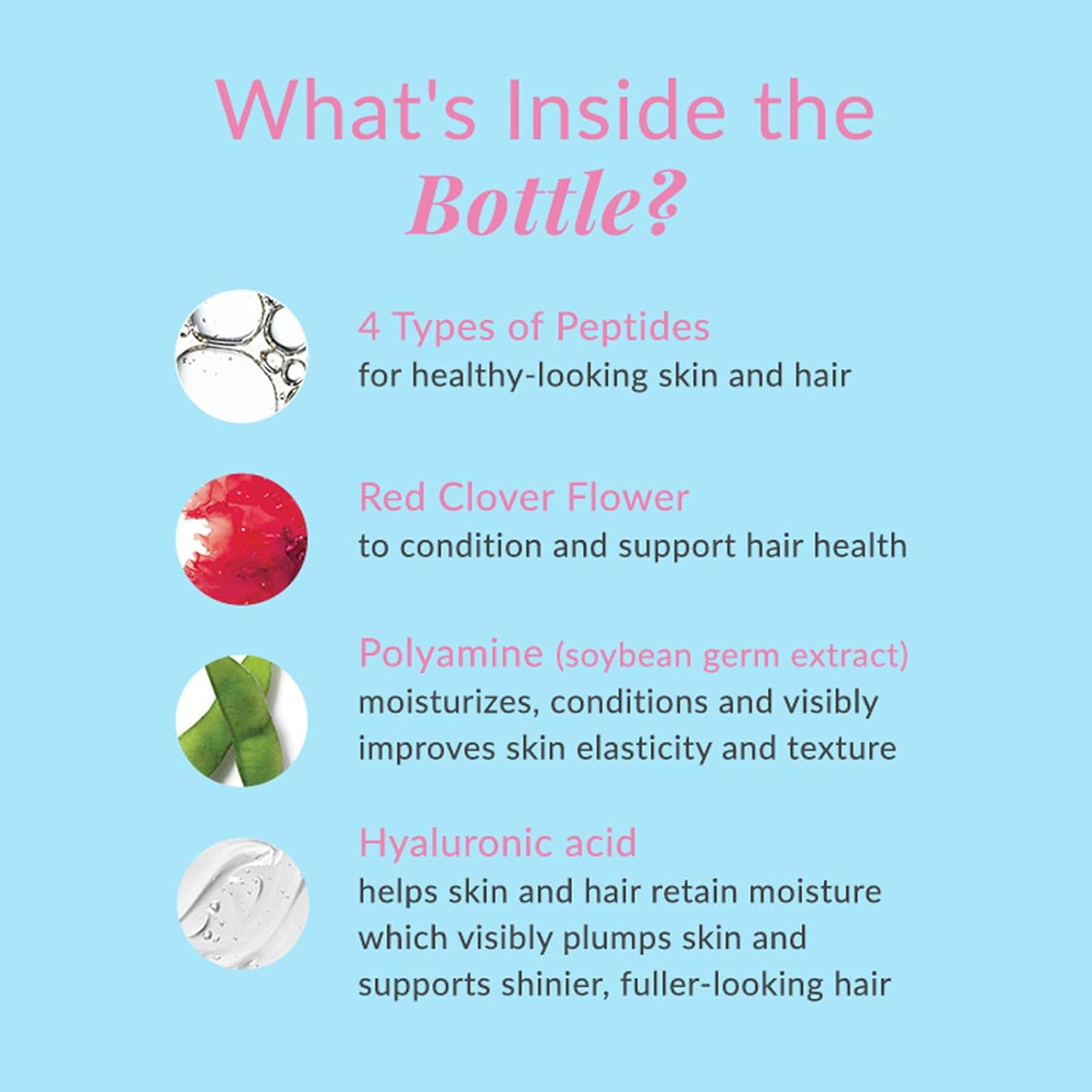 - Contains hair and skin conditioning ingredients such as polyamine (soybean germ extract), red clover flower extact and hyaluronic acid
