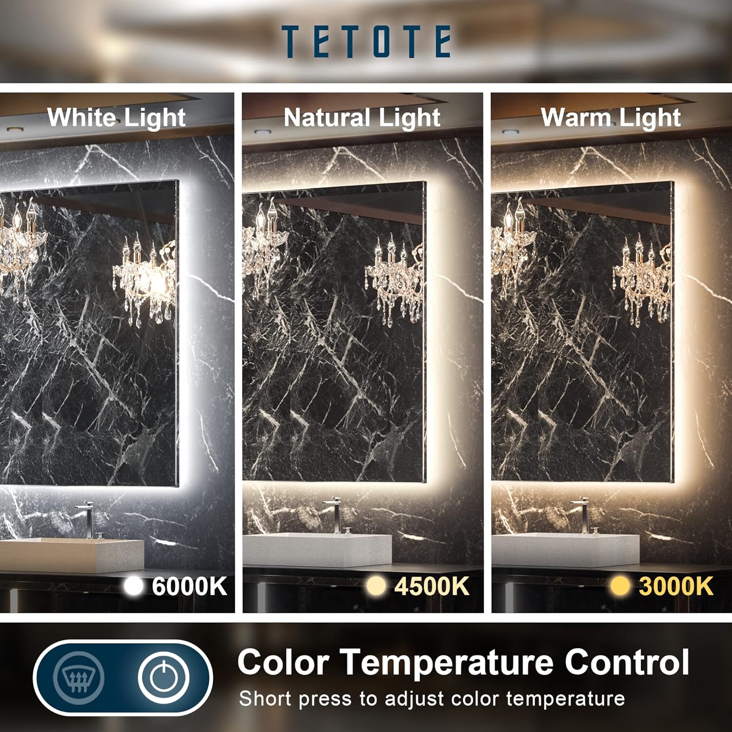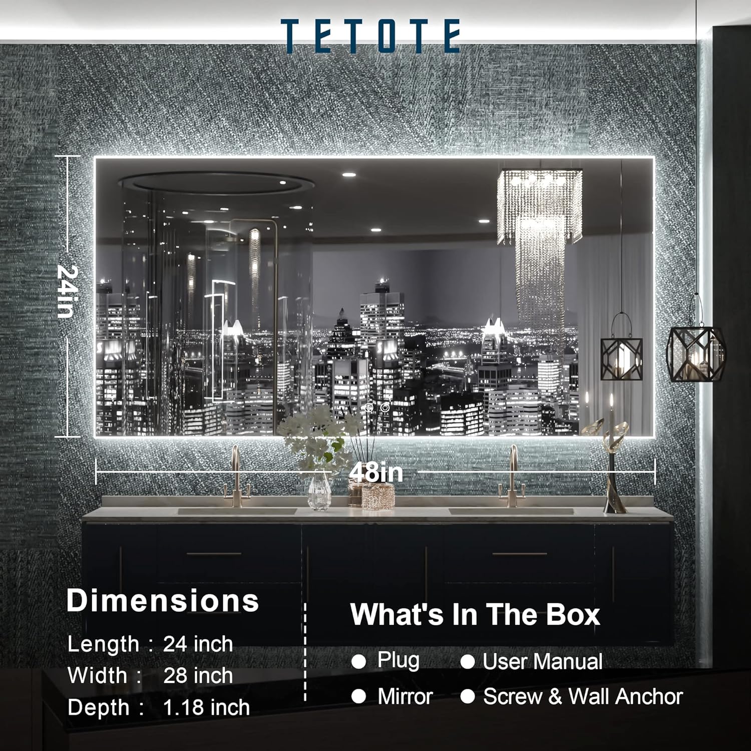 TETOTE 48 x 24 LED Backlit Bathroom Mirror with Light,3Color White/Warm/Natural,Anti-Fog Lighted Mirror,Dimmable,Vanity Mirror,Wall Mounted