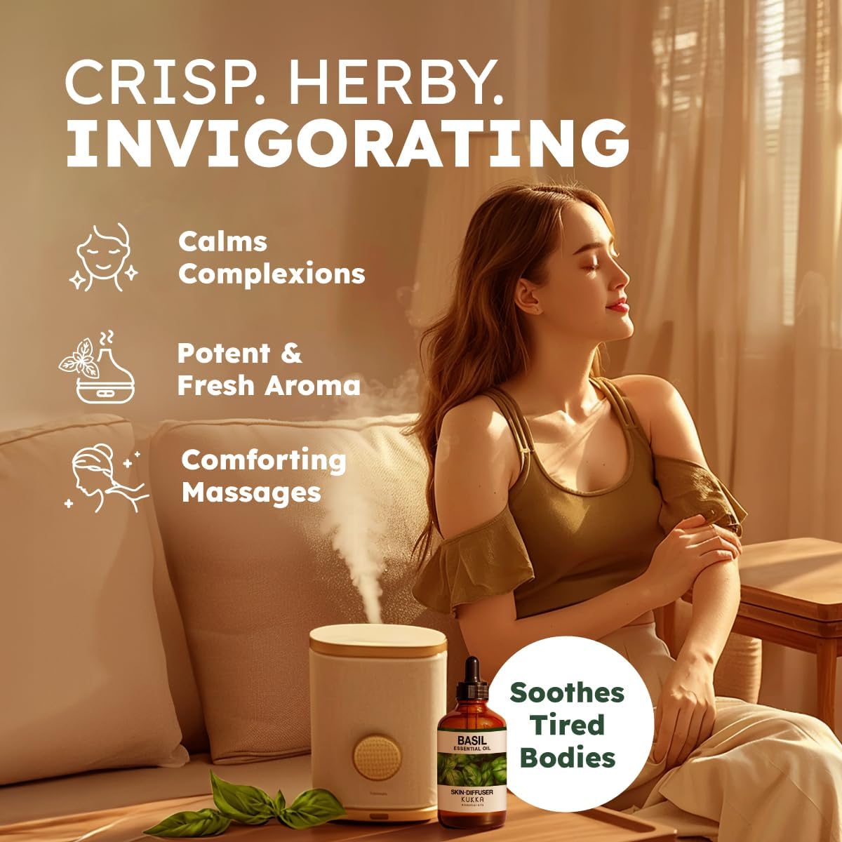 - Basil essential oil for diffuser. Create a soothing and relaxing atmosphere as you wind down and chill with the scent of fresh basil. Diffuse 2-3 drops of basil oil to an essential oil diffuser for 30 minutes to refresh and enliven your home.