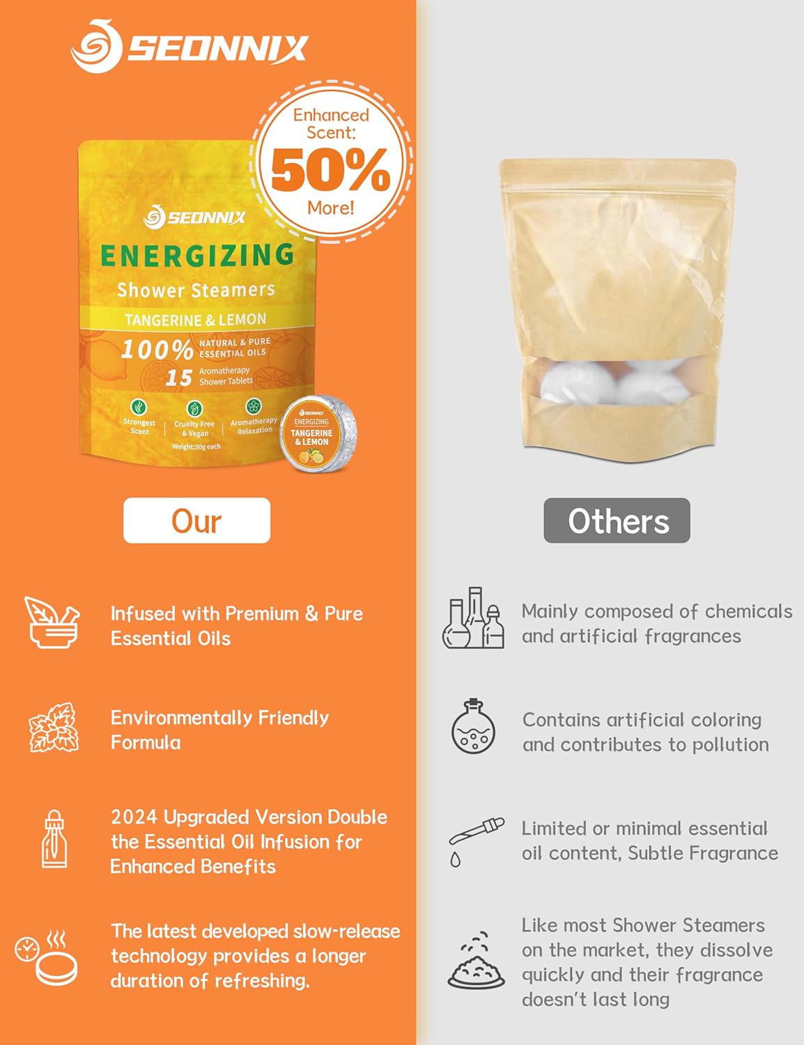 - Indulge in Nature's Goodness: Immerse yourself in the rejuvenating power of our shower steamers infused with 100% all-natural & organic Tangerine and Lemon essential oils. Experience the benefits of our exclusive time-release technology, which ensures extended usage and clean dissolving, without leaving any residue behind. Boost your mood, relieve stress, and indulge in a truly invigorating aromatherapy experience
