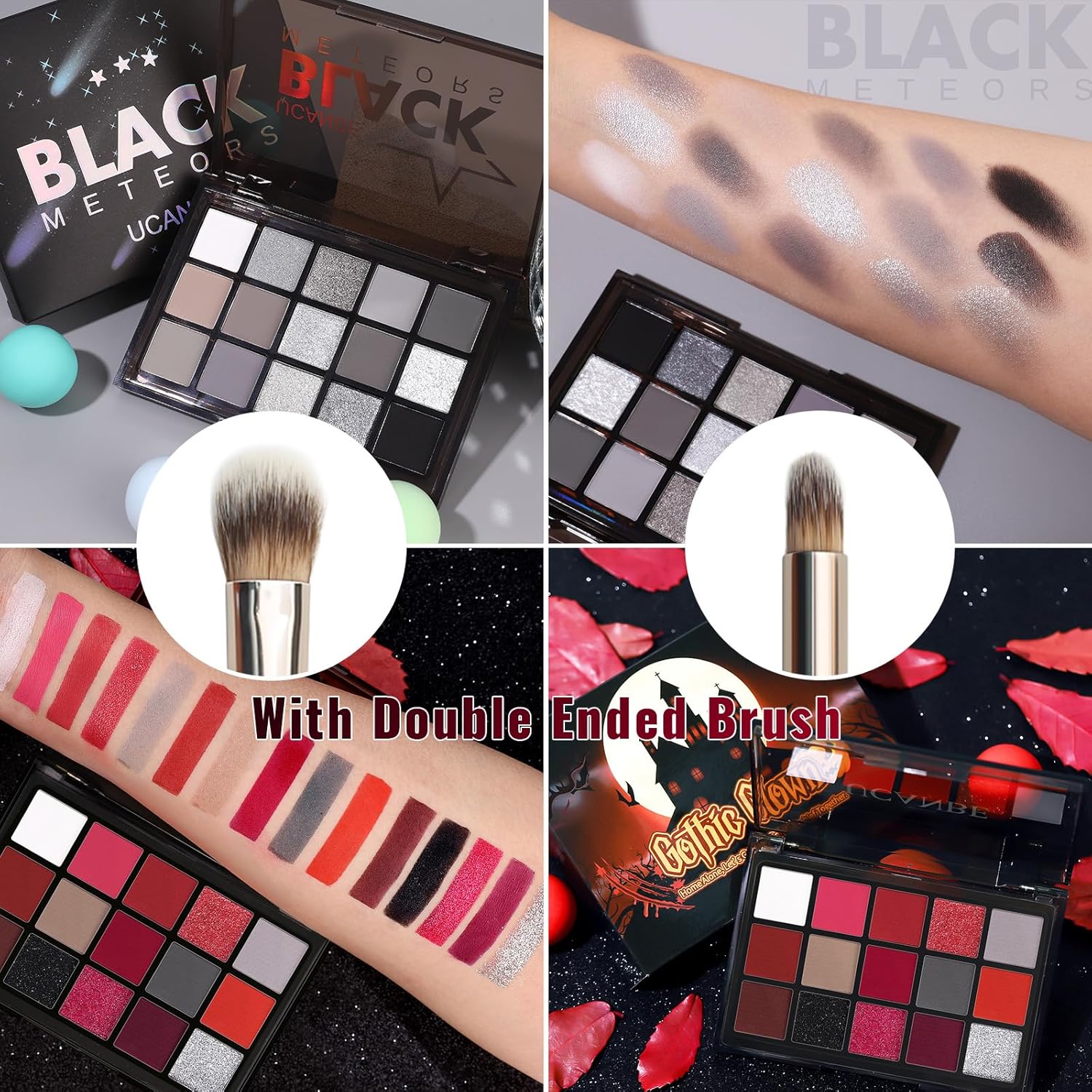 - ❤. This makeup eyeshadow kit with BLACK METEORS and GOTHIC CLOWN palette, both shades mixture of stunning dark smokey red shades that velvety & go on smoothly texture with matte and foil finishes to create next level HALLOWEEN vibe to unleash your artistry. Each blendable, buildable and long-lasting with silky powder come in a fun acrylic case,suit very skin tone and eye color.