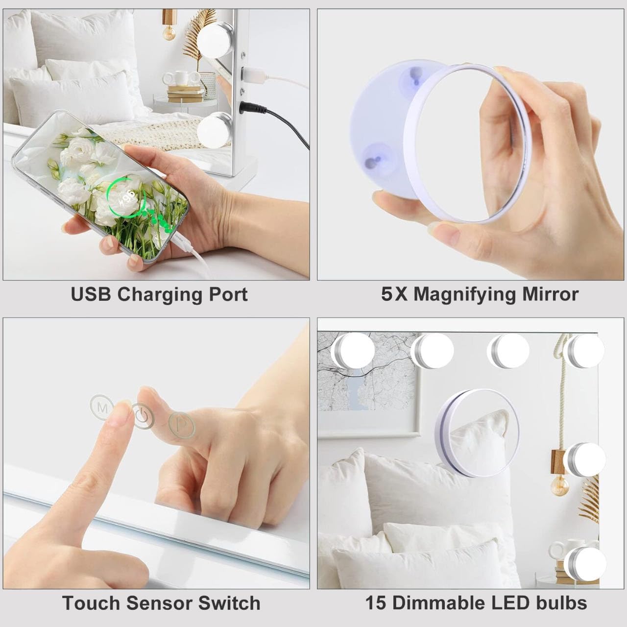 - Vanity mirror with 15 Dimmable Bulbs Lights:12 big bulbs lights along three sides of mirror will provide perfect lighting for makeup application.Made from premium flame retardant metal material and mirror glass,perfect looking and resistance for scratch