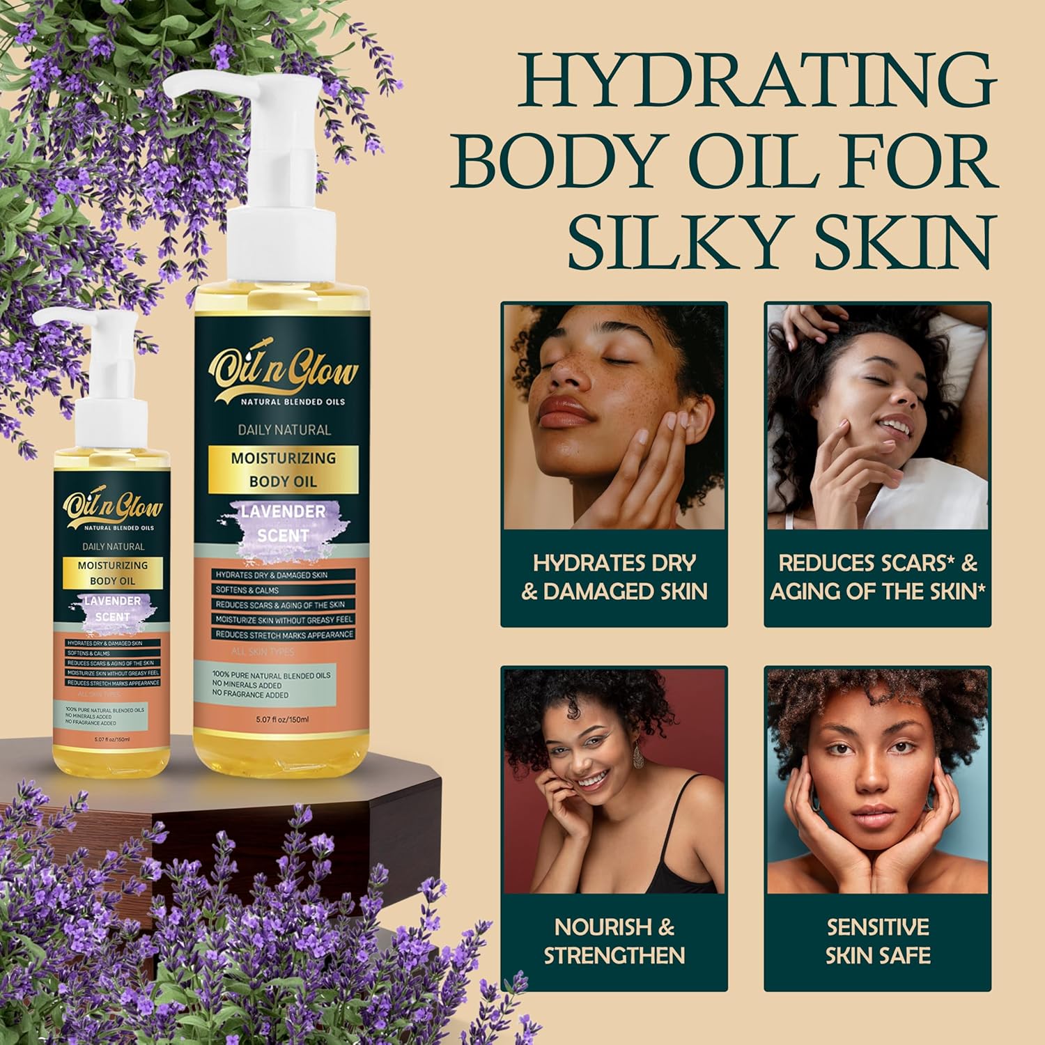 - FREE FROM HARSH CHEMICALS: Our lavender body oil is crafted without parabens, phthalates, artificial fragrances, or harsh chemicals, making it an ideal body oil for women and men with sensitive skin. Powered by nature, this nontoxic, non-comedogenic solution is packed with nutrient-rich oils like body coconut oil, bio oil for scars, and almond body oil. Experience pure hydration with a body oil non greasy finish that respects your skin’s balance and leaves you feeling confident every day.